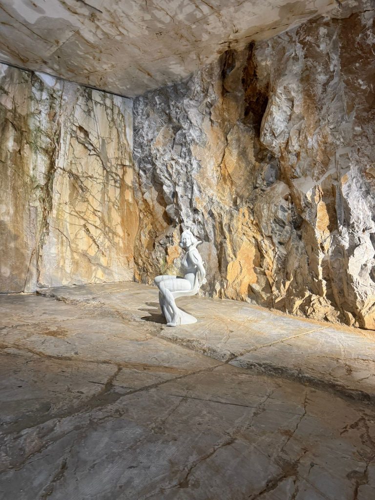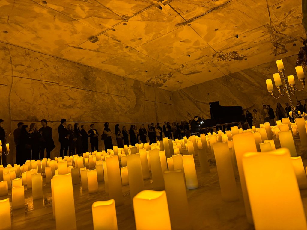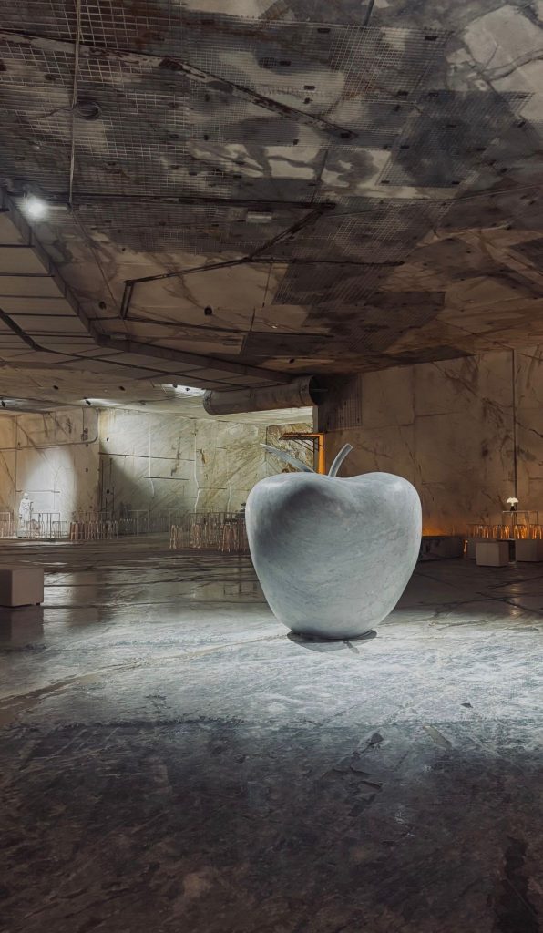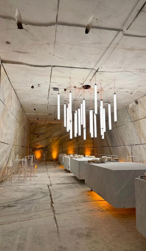Scultura, tecnologia applicata al marmo e un’ambientazione oggettivamente da lasciare a bocca aperta per il party organizzato da Alberto Franchi nella sua cava in galleria. Particolarmente suggestiva la distesa di candele con un pianoforte al centro; particolarmente affollato il grande buffet con taglierini nei fagioli, salumi, torte di verdura, baccalà… vini e bollicine, un’area sushi un fornitissimo bar dove si serviva pure il “calacatta rum”. Ospiti apuani e internazionali, servizio navetta per salire in cava, musica diffusa, “esibizioni” delle macchine laser che scolpiscono il marmo. Insomma una festa da ricchi che solo a Carrara si può organizzare.