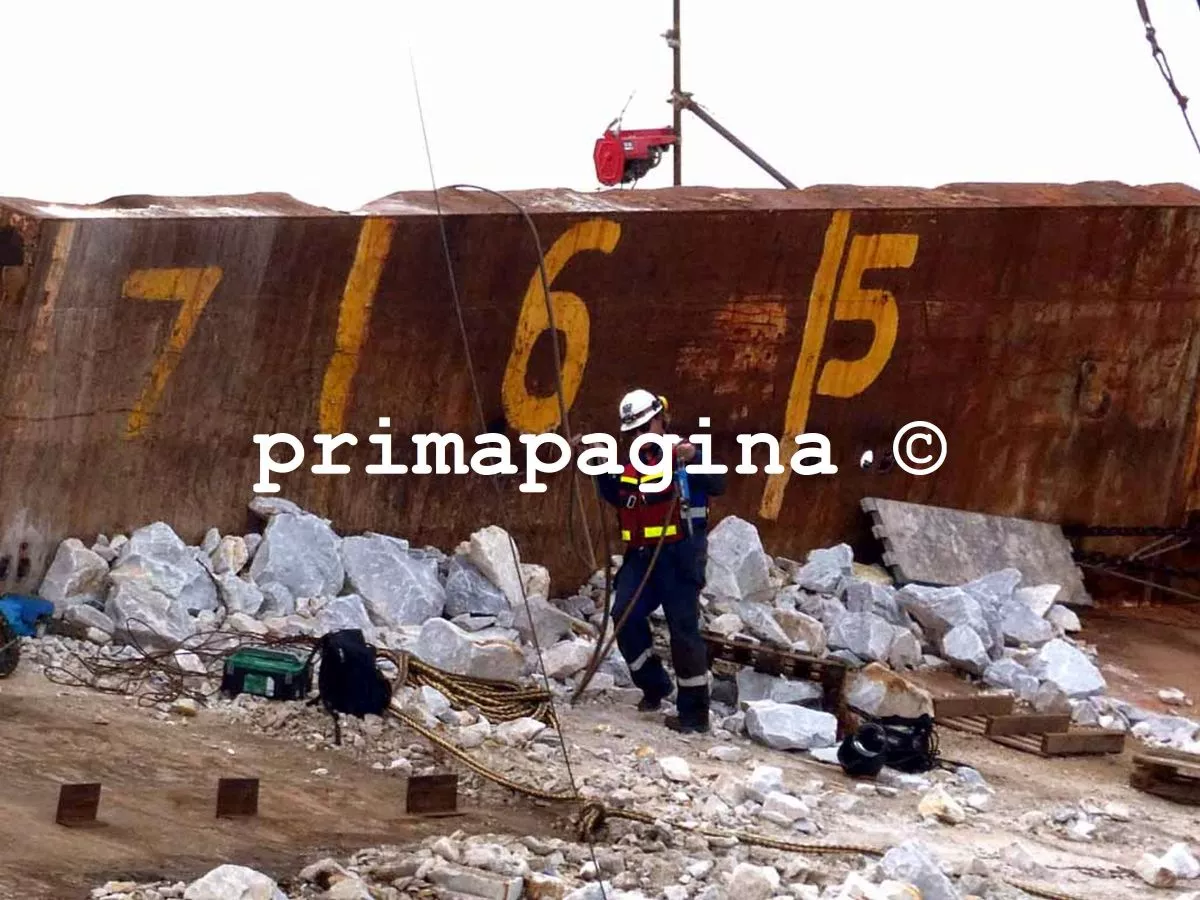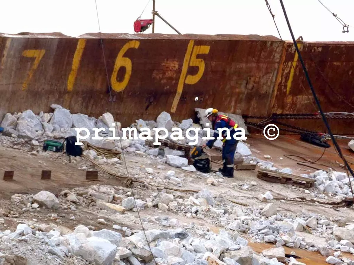 Questa mattina, sul ponte dell’imbarcazione, erano ancora presenti alcuni operai impegnati nella rimozione delle ultime scaglie di marmo rimaste accatastate. Si tratta di quantità residuali, mentre la gran parte del carico è già stata rimossa nelle scorse settimane grazie a un lavoro lento, delicato e condizionato dalle condizioni del relitto.